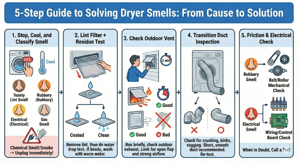 A dryer is a heater that depends on airflow to stay sane. When airflow drops, heat doesn’t just “build up”—it concentrates in the places lint likes to hide. That’s why one load can smell “toasty” and the next can smell like hot rubber or even sharp electronics. The move is simple: name the smell, then follow the shortest path to a safe answer.